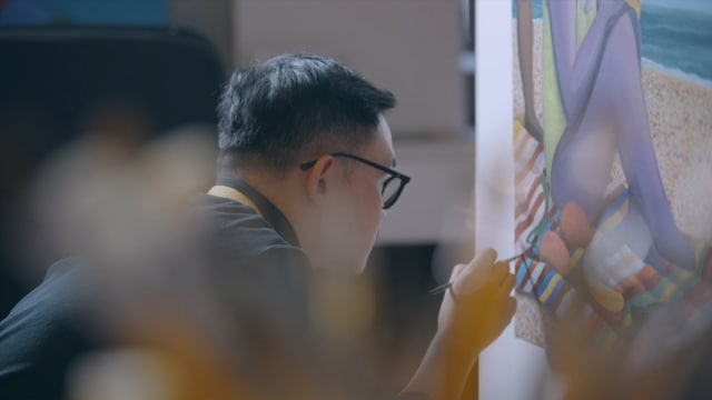 "This work is inspired by a journey I took with artist friends I met during the residency, which is significant to me. The depiction of the seaside, mangoes, and seemingly chaotic yet secretly ordered clouds in the painting serves as imagery of inner desires from a personal experience. I portray them with high-saturation colors, contrasting with the ambiguous, sensitive, and fragile subtle emotions hidden beneath the flower faces of the figures." (Huang Huihong, 2024)