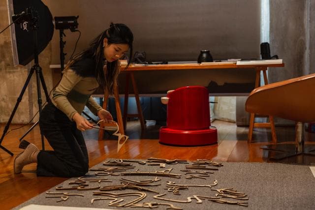 First, I used an iPhone camera with inverted color settings and the live mode as a way to turn the physical world into lyrical abstractions. Through this process, I gathered an archive of abstract images and used them as raw materials to construct the scenes. The images were printed and stuck to the surface of wooden panels and laser-cut wooden shapes. The panels form spaces and the shapes form entities representing the "spirit" said to flow around in the astral world.